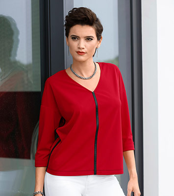 Pour entrer en douceur dans le printemps, on mise sur les jeux de contraste : le noir reste la base de la silhouette, mais il est associé à des teintes plus claires, plus vives. Au choix, on pourra opter pour le rouge et le blanc, pour des silhouettes graphiques, ou le beige, pour jouer l’élégance. On aime tout particulièrement la veste longue en tricot noire et beige, parfaite sur une jupe ou un pantalon noir pour un look classique chic. Pour un look plus moderne, on craque pour un débardeur rouge, facile à associer à du blanc ou du noir, voire les deux ! Ce top rouge dont les coutures sont soulignées d’un galon noir sera parfait avec une veste noire et un pantalon blanc, ou le contraire.